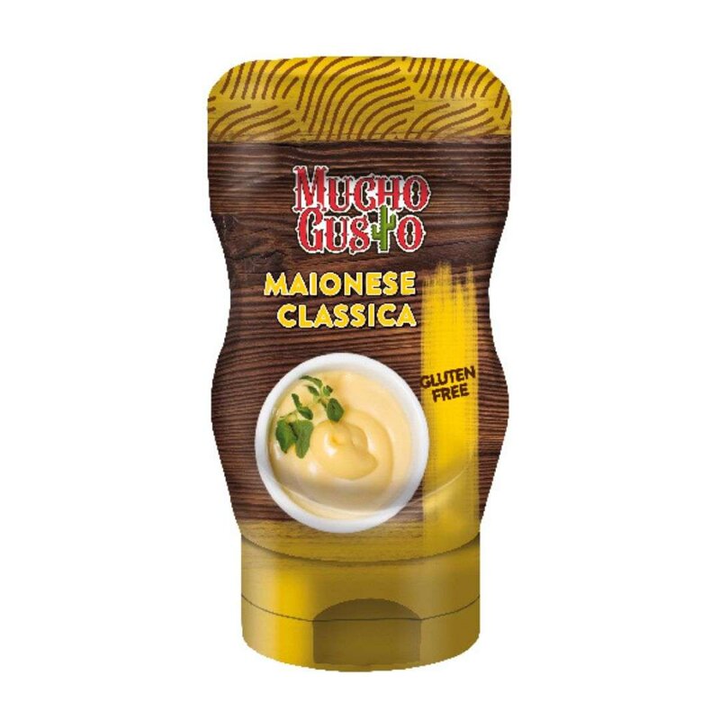 Ingredienti: olio di semi di girasole (75%), uova intere pastorizzate di galline allevate a terra (10%), aceto di vino, succo di limone, sale, zucchero, amido modificato di mais, senape, correttore di acidità: E270, conservante: E202.