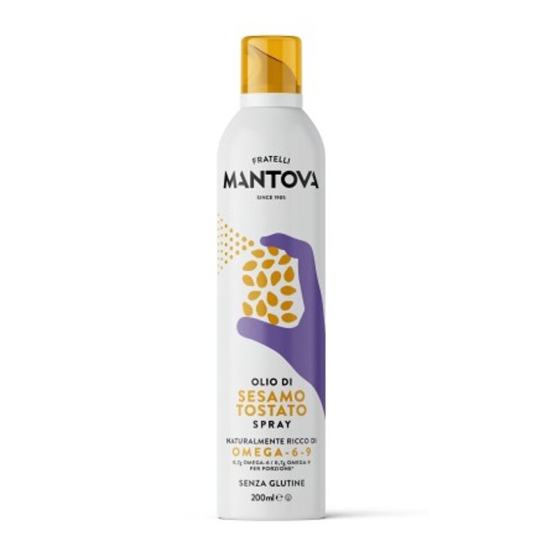 Olio di Semi di Sesamo Tostato spray puro al 100%. Contiene 0,7 g Omega-6 e 0,7 g Omega-9 per porzione che contribuiscono al mantenimento di livelli normali di colesterolo nel sangue.